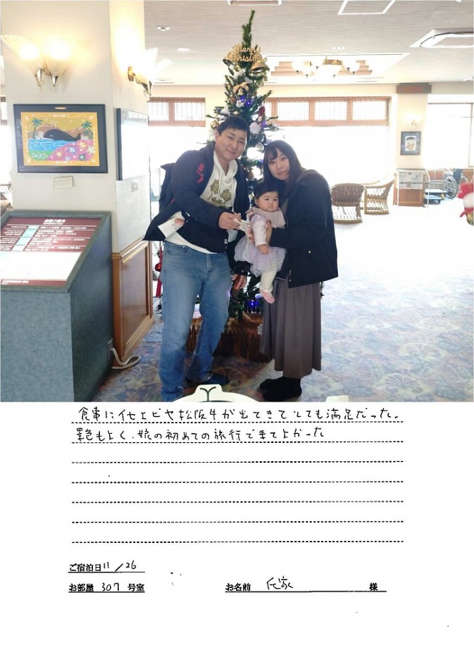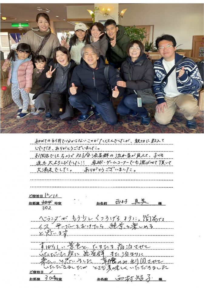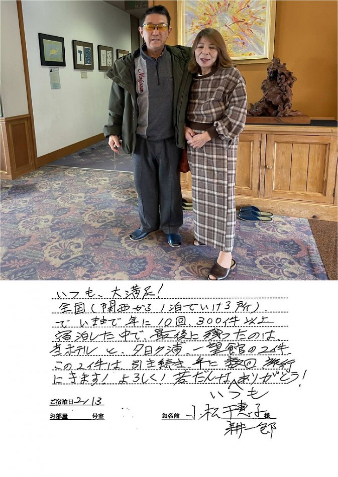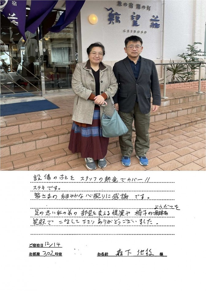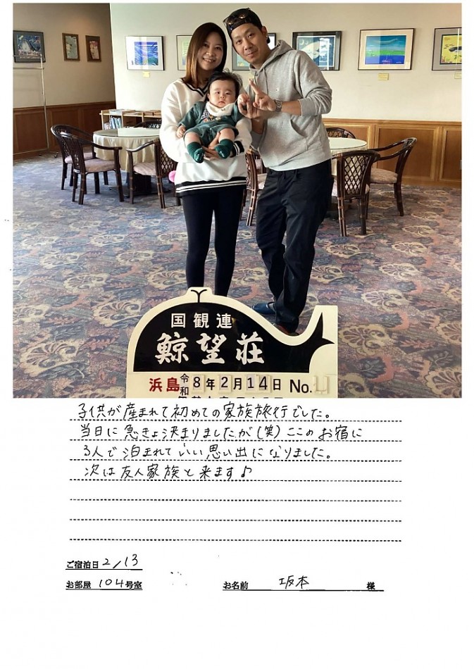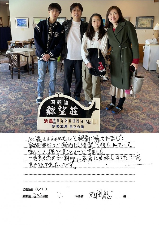 実際にご宿泊頂きました、お客様のご感想を、ご了解を頂き、実名、実住所にて掲載させて頂いております。 お客様から頂戴いたしましたたくさんの「お叱り」「ご意見」「お褒め」の声は鯨望荘の“宝物”です。 貴重なお客様のお声を、宿の改善とスタッフの励みとして、ご満足頂けるお宿を目指し日々努力を重ねていきます。