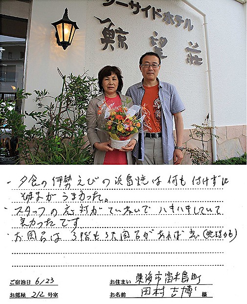 実際にご宿泊頂きました、お客様のご感想を、ご了解を頂き、実名、実住所にて掲載させて頂いております。