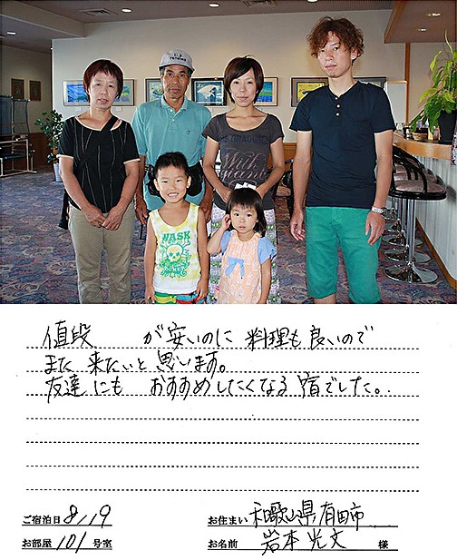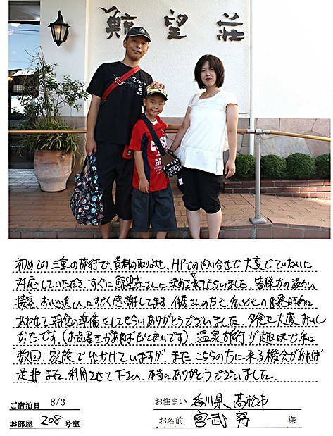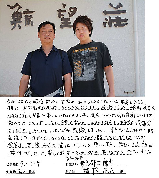 実際にご宿泊頂きました、お客様のご感想を、ご了解を頂き、実名、実住所にて掲載させて頂いております。