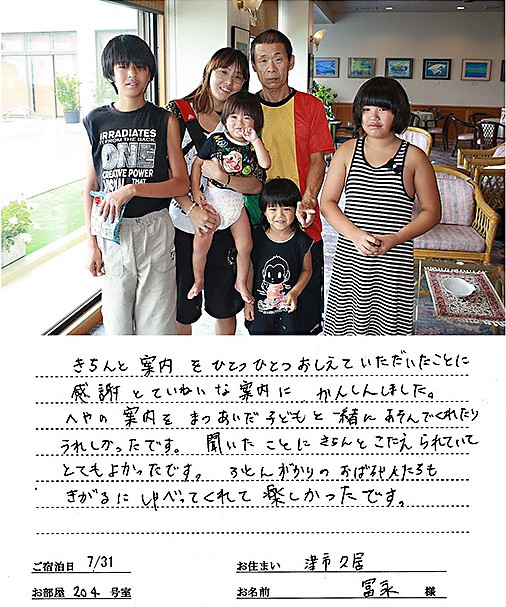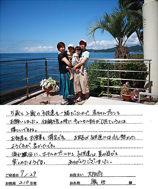 ご滞在中は、海、プールでおもっいきっり遊んで頂き、家族でゆっくり貸切風呂をお楽しみ頂けたご様子でとても嬉しく存じます。
