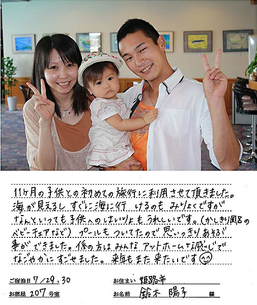 初めての赤ちゃん連れはとても不安なものです。私どもでご用意させて頂きました、赤ちゃんプランで安心してご宿泊頂けたご様子で本当に良かったです。