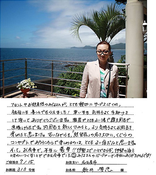 本日、新井さまに頂きました喜びのお声を励みにして、今後もご満足頂けるお宿を目指し、スタッフ一同一生懸命に努力して参りますので、ますますのご愛顧宜しくお願い申し上げます。