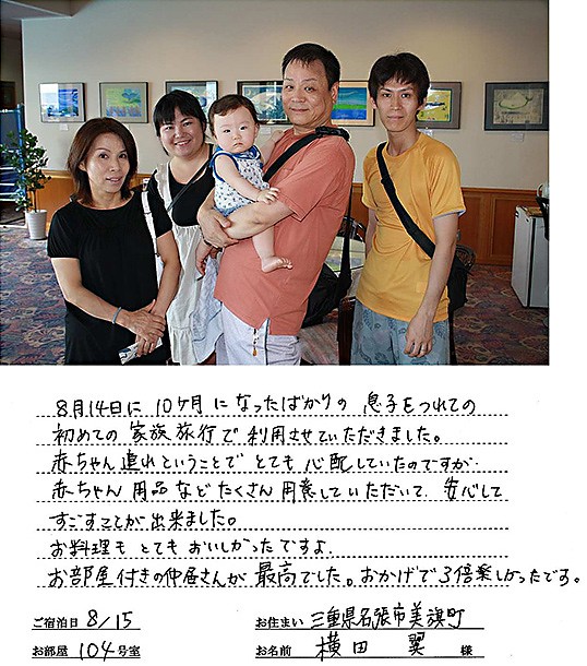 ご滞在中は、海、プールでおもっいきっり遊んで頂き、家族でゆっくりお楽しみ頂けたご様子でとても嬉しく存じます。