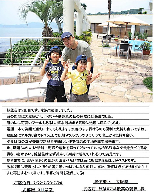 この度は、大切な家族旅行に、数ある宿より私ども鯨望荘をお選び頂きまして誠にありがとうございます。