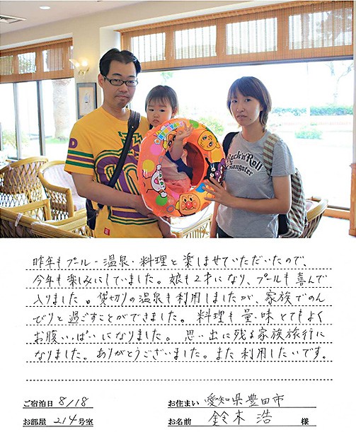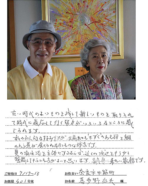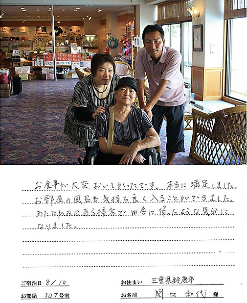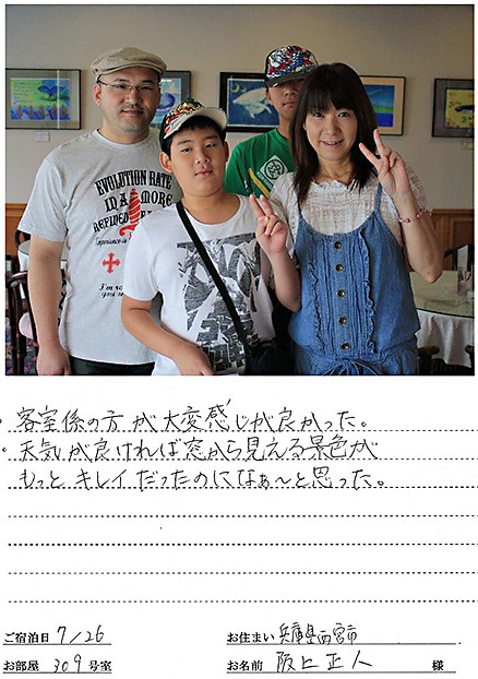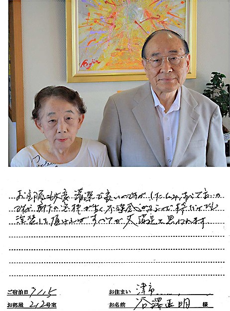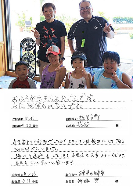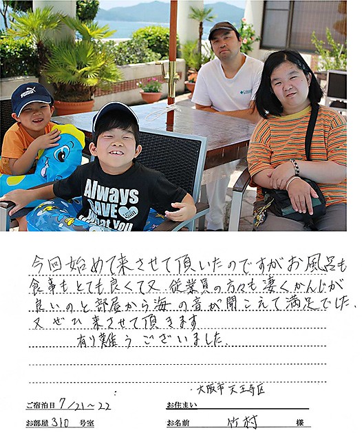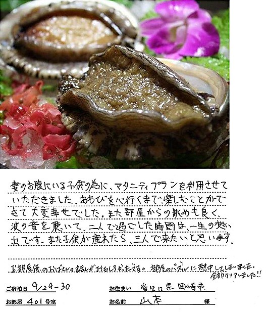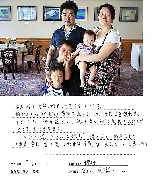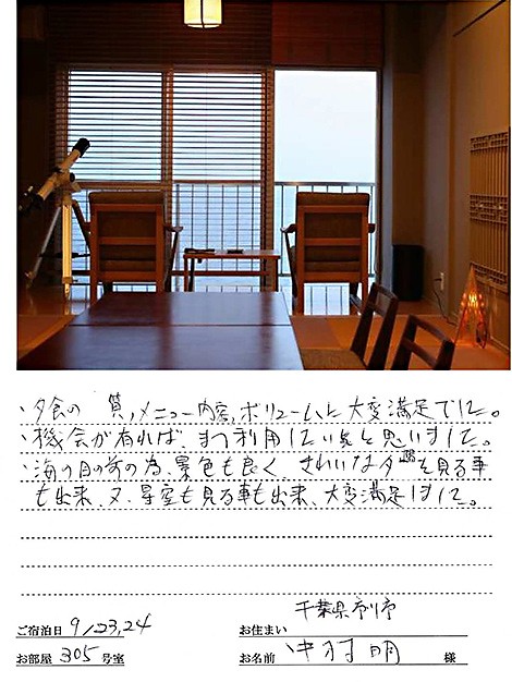 実際にご宿泊頂きました、お客様のご感想を、ご了解を頂き、実名、実住所にて掲載させて頂いております。 お客様から頂戴いたしましたたくさんの「お叱り」「ご意見」「お褒め」の声は鯨望荘の“宝物”です。 貴重なお客様のお声を、宿の改善とスタッフの励みとして、ご満足頂けるお宿を目指し日々努力を重ねていきます。